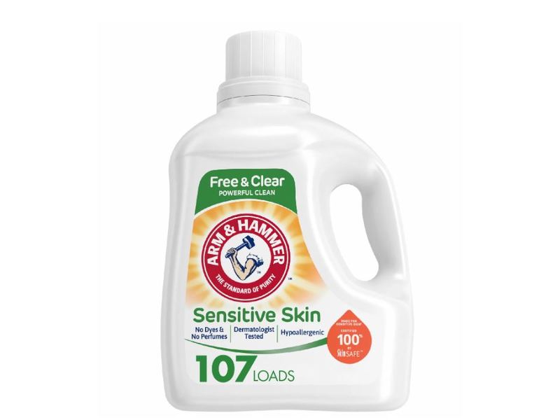 ARM & HAMMER Sensitive Skin Free & Clear liquid laundry detergent has no dyes, perfumes, or preservatives so it's gentle on skin, but powerful on dirt. Special, lower-sudsing formula rinses cleaner and is designed to work in both standard machines and today’s energy conscious High Efficiency (HE) models. Special agents in the detergent trap the soil in the wash water, so it rinses away and doesn't redeposit on your clothes.