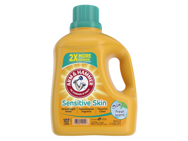 ARM & HAMMER Sensitive Skin Plus Scent is concentrated with 2X powerful stain fighters in every drop vs. leading bargain detergent. This advanced dye free laundry detergent is specially formulated to work in both standard washers and today's energy conscious High Efficiency (HE) models. It is a sensitive laundry liquid detergent that is free of dyes and that has a fragrance designed and clinically tested to be gentle on sensitive skin