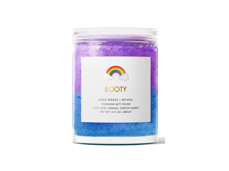 Rainbow Booty Butt Polish. A lightweight, exfoliating polish full of brightening mixed berries + retinol. Designed to smooth texture, tighten sagging, and visibly reduce the appearance of stretch marks on the booty.