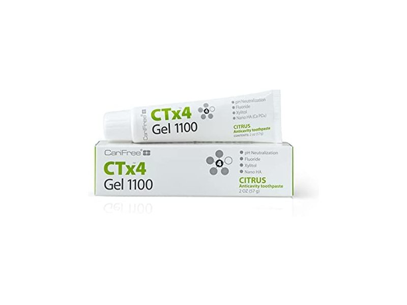CTx4 Gel 1100 is a low abrasion tooth gel that combines the proven anti-caries benefits of .24% neutral sodium fluoride with bio-available nano hydroxyapatite crystallites, xylitol, and CariFree’s unique, patented pH+ technology.