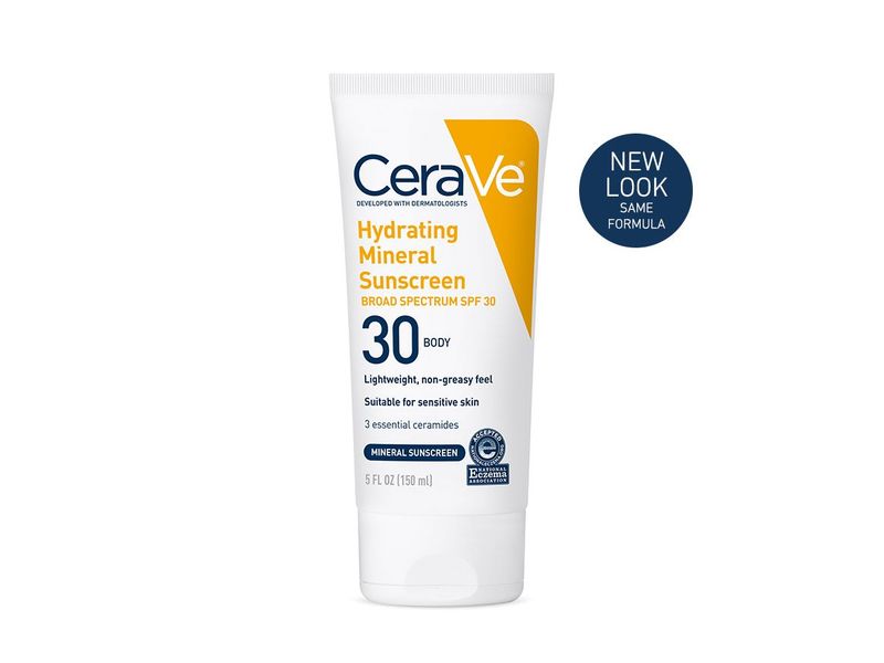 CeraVe Hydrating Mineral Sunscreen Body Lotion with Broad Spectrum SPF 30 is an oil-free, 100% mineral sunscreen formulated with titanium dioxide and zinc oxide that forms a barrier on your skin to help reflect the sun’s UVA and UVB rays.