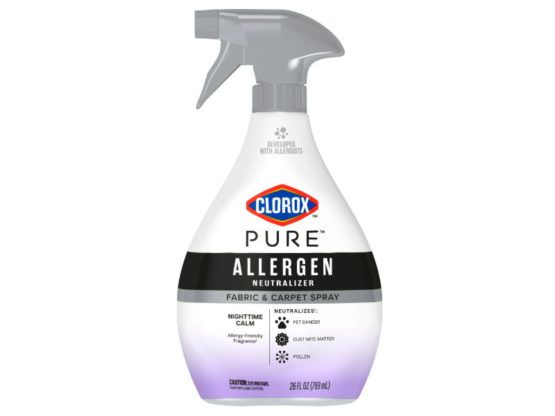 Clorox PURE Allergen Neutralizer Fabric and Carpet Spray developed with allergists changes the structure of allergens it comes into contact with, rendering them inactive