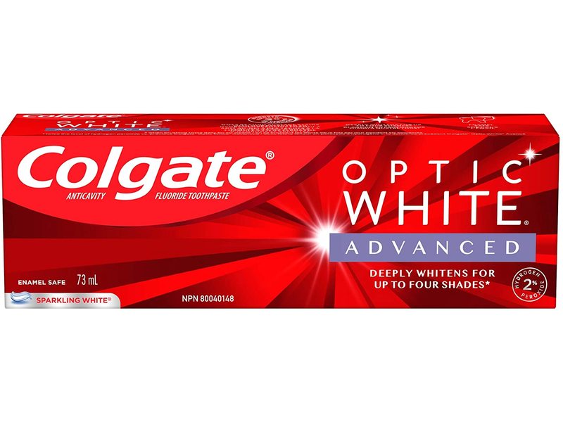 Colgate® Optic White® Advanced Toothpaste deeply whitens for up to 4 shades.* It contains 2% hydrogen peroxide, a professionally recommended whitening ingredient.