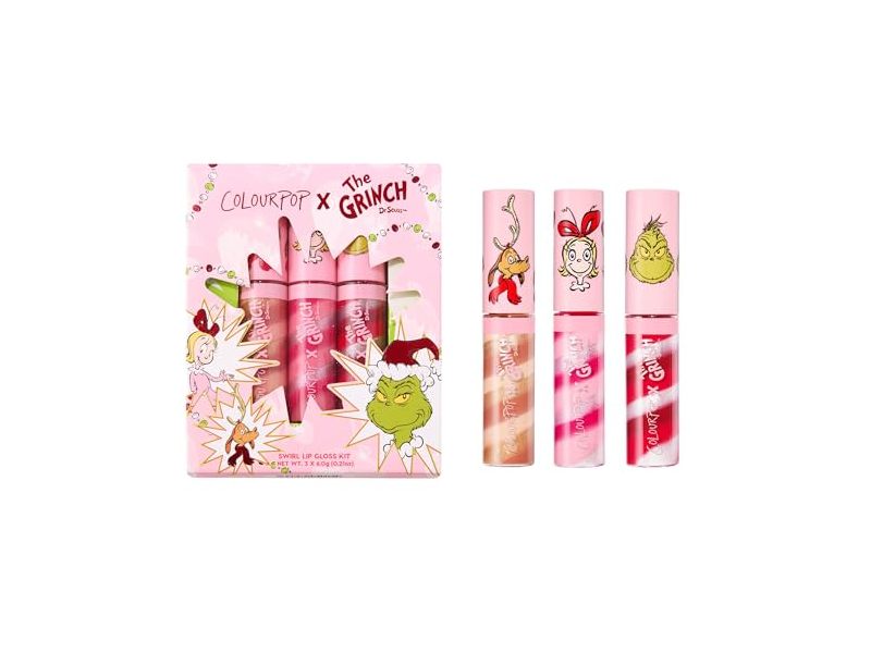 The ColourPop x The Grinch limited-edition Swirl Lip Gloss Kit features shades inspired by The Grinch, Cindy-Lou Who and Max. Swipe on hydrating sheer nude, pink and berry shades that make your lips shine without feeling sticky.