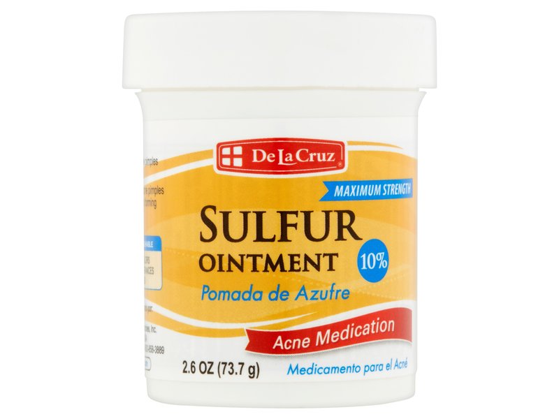 De La Cruz® Sulfur Ointment is a maximum strength acne treatment. It penetrates the pores and dries and clears pimples and blackheads. In addition, it helps to keep new pimples and blackheads from forming. This effective ointment has been allergy tested and does not contain fragrance, parabens or artificial colors. It is also non-comedogenic (does not clog pores).  Made in USA.