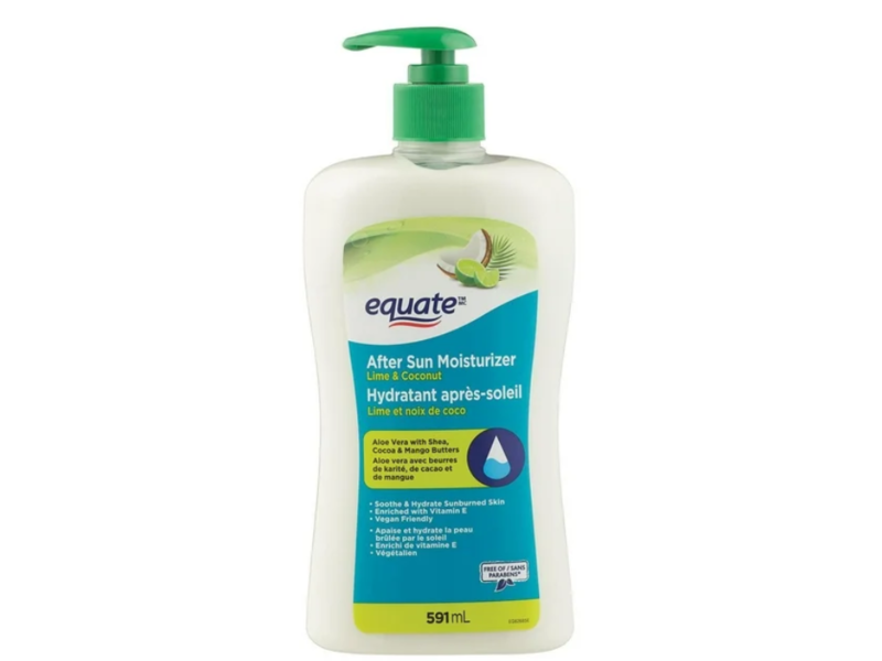 Equate After Sun Coconut and Lime Lotion is an ultra-rich moisturizer that is blended with exotic island botanicals, shea and cocoa butters, and soothing Aloe Vera. When applied, it helps replenish moisture that is lost from environmental effects such as the sun, water, and wind