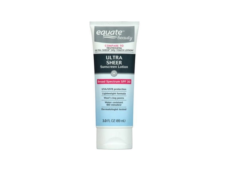Protect your skin from the sun with Equate Beauty Ultra Sheer Sunscreen Lotion. This provides effective broad-spectrum protection against the sun's harmful UVA/UVB rays. Equate sunscreen lotion has an oil-free sheer formula that absorbs quickly and won't clog pores. This skin-care accessory provides over an hour of water resistance and is a lightweight formula tested by dermatologists. Help take good care of your skin.