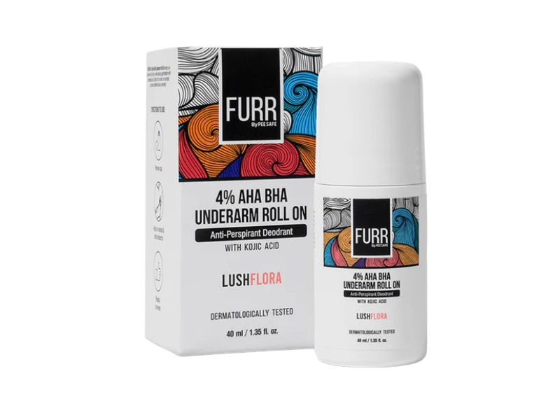The FURR roll-on utilizes a blend of 4% AHA (Alpha Hydroxy Acid) and BHA (Beta Hydroxy Acid) to gently exfoliate the underarm skin, effectively eliminating odour-causing bacteria.