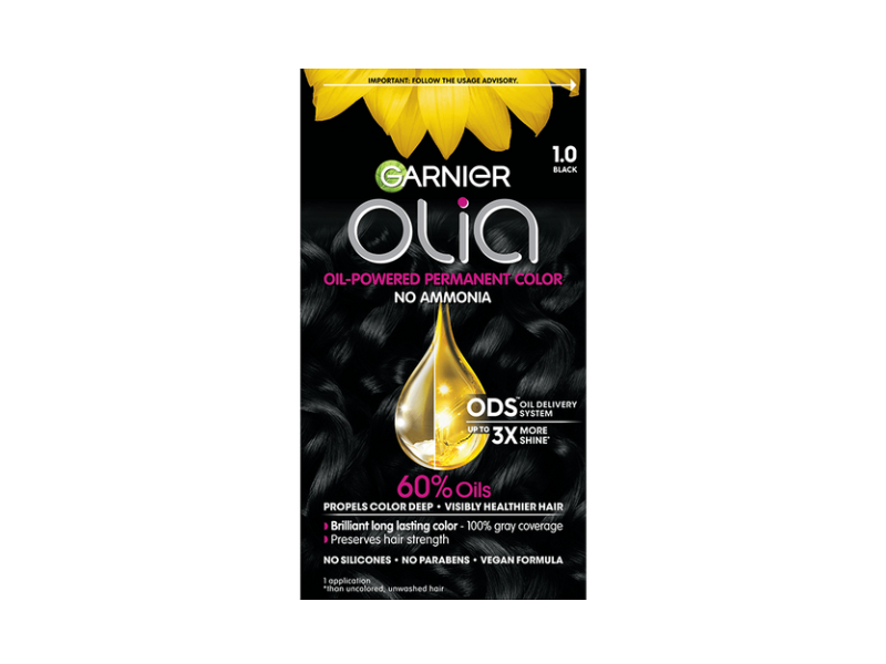 Garnier Olia shade 1.0 Black is darkest black hair dye. On the hair shade spectrum, it’s a level 1 hair color that looks natural and provides 100% gray coverage. For hair nourishing, easy to use permanent hair dye, temporary hair color, root touch up, or to enhance your natural hair color, turn to Garnier hair color