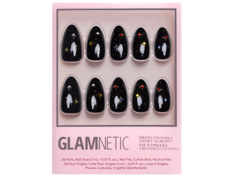 Shine bright with the Winter Comet Nail Set. These short almond nails feature a sleek black solid base, adorned with raised gold foil sparkles and colorful gems. Perfect for adding a touch of celestial glam to your holiday looks.