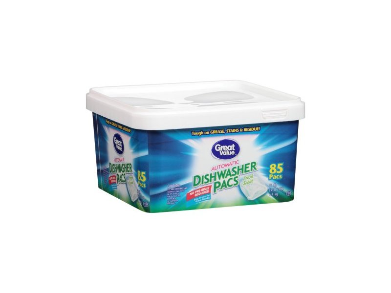 There is no measuring or guesswork when using Great Value Fresh Scent Dishwasher Powder Packs with Grease Fighting Action. These Fresh Scent Dishwasher Packs, 85ct, are pre-measured single-use pouches that you just pop into the dishwasher's detergent dispenser. There are 85 dishwasher packs in this extra-large package of Fresh Scent Dishwasher Powder. Great Value Fresh Scent Dishwasher Powder Packs have a fresh scent and are phosphate free.