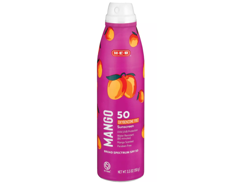 H-E-B oxybenzone free mango scented sunscreen spray next time you hit the pool, beach or river. This SPF 50 sunscreen blocks premature aging UVA rays and sunburn causing UVB rays for days spent under the sun. And thanks to the mango scent, sun protection never smelled so good. Made in Texas for Texans.