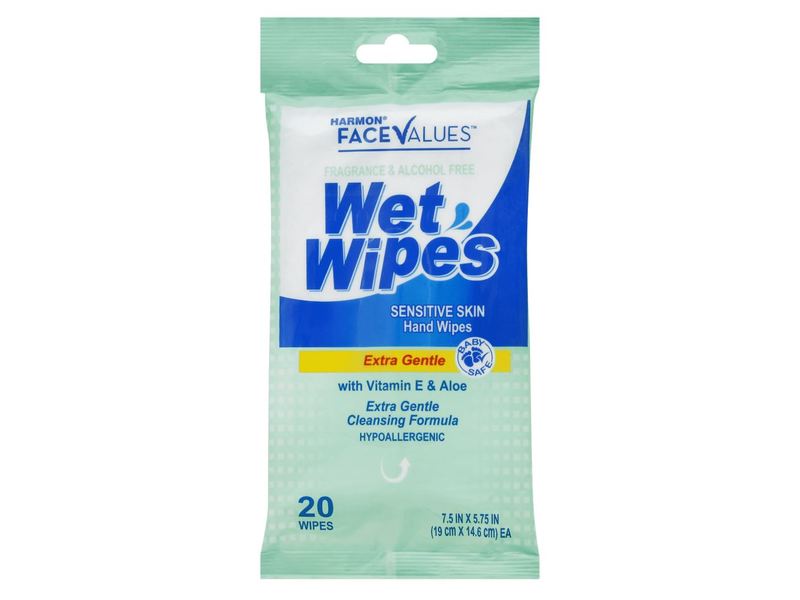 Harmon Face Values Sensitive Skin Wet Wipes are enriched with aloe, vitamin E and chamomile to help moisturize and soothe skin. There gentle to skin and a perfect clean up for hands and face.