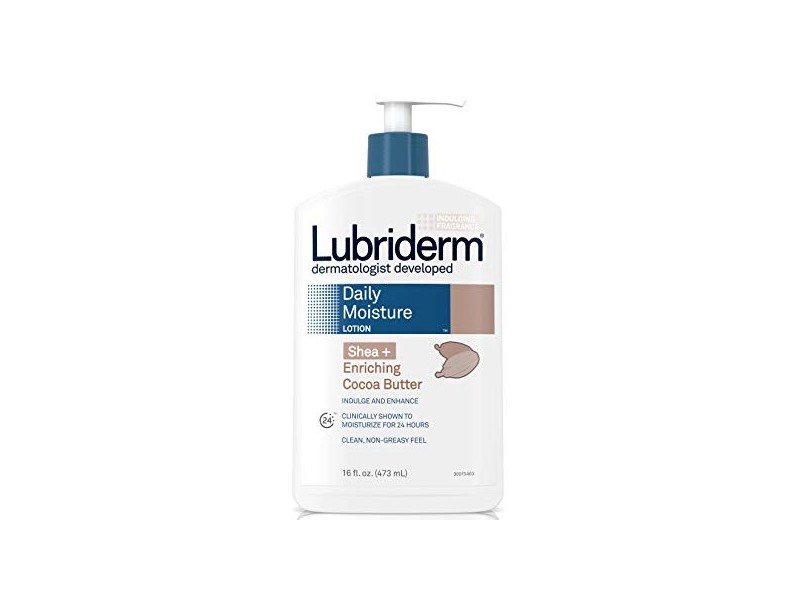 16-fluid ounce pump bottle of Lubriderm Daily Moisture Lotion with Shea + Enriching Cocoa Butter to transform dry, dull skin into radiant, healthy-looking skin
