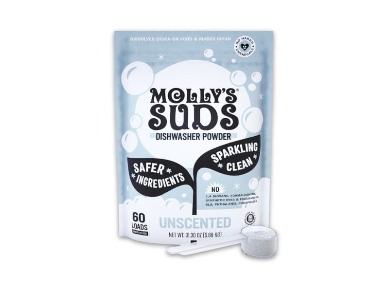 Molly’s Suds Dishwasher Detergent Powder cuts through grease & stuck-on food stains to leave dishes sparking with zero residue, streaks, or other mineral build-up. Simple and effective, Molly’s Suds products are free from ethoxylates and certified cruelty-free by Leaping Bunny.