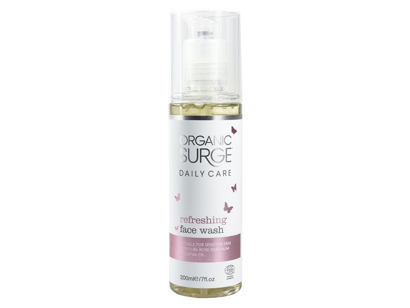 Organic Surge daily care face wash rinses away daily dirt and impurities, removing make-up on the face and around the eyes. The 100 percent natural lather and essential oils help to restore skin's natural balance. It is a natural and organic face wash, untouched by harsh chemicals and enriched with organic rose geranium essential oil. It cleanses, refreshes, moisturises all skin types and clears a dull, sluggish complexion.