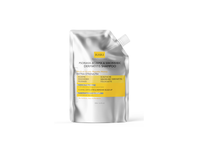 Rida Hair Research Institute psoriasis, eczema & seborrheic dermatitis shampoo medical grade manuka honey extra strength eczema ringworm psoriasis scalp acne seborrheic dermatitis folliculitis clinically proven to eliminate itching, flaking, and scalp irritation cleans, exfoliates & removes build-up reactivates hair follicles to stimulate hair regrowth.