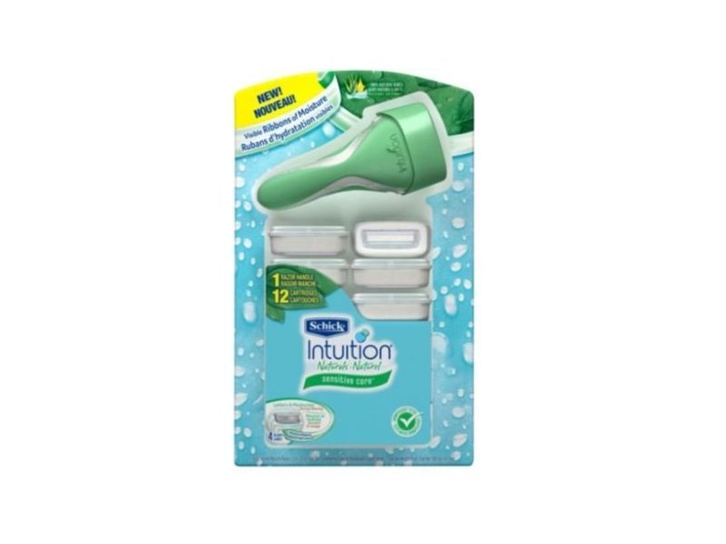 The Schick® Intuition® Naturals Sensitive Care® Razor with 100% natural aloe and vitamin E moisturizes and softens skin. It's the first and only razor system that lathers, shaves and moisturizes during shaving - in one easy step - so there's no need to use shave gel. It simplifies your shave and cares for your skin. It's also hypo-allergenic, gentle on your skin, and features a 4-blade pivoting head to glide smoothly along the contours of your legs and body.