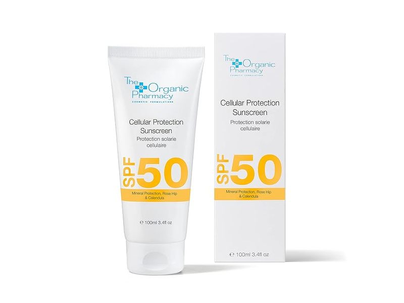 The Organic Pharmacy's Cellular Protection Sunscreen SPF 50. Carefully formulated with reflecting minerals and herbal ingredients, this sunscreen prevents UV damage to your skin by reflecting it, rather than absorbing it like chemical-based sunscreens do.