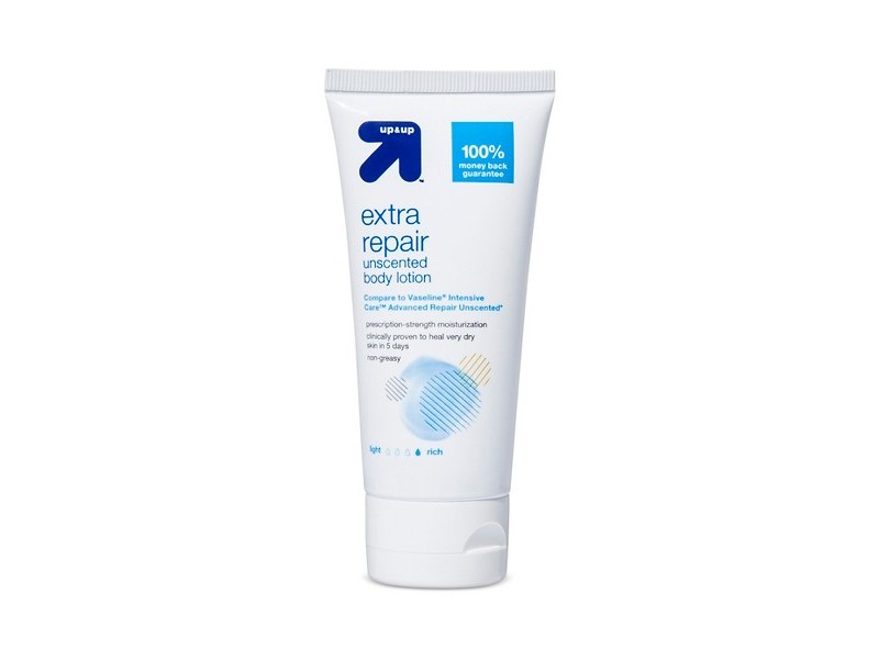up & up extra repair unscented hand and body lotion penetrates multiple layers of skin and infuses it with soothing, repairing moisture that helps heal skin after one use. This non-greasy formula provides prescription-strength hand and body moisturization and is clinically proven to heal very dry skin in 5 days. Compare to Vaseline® Intensive Care™ Advanced Repair Unscented