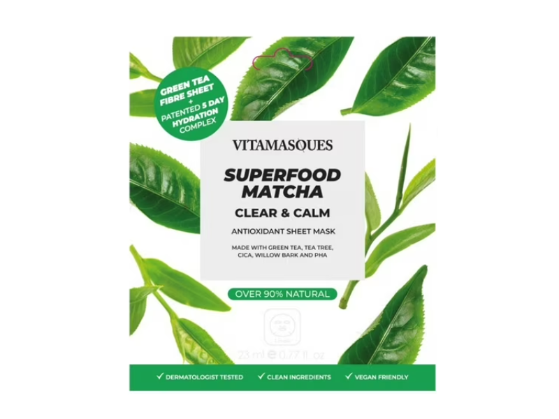 The Vitamasques Superfood Matcha Sheet Mask has been formulated with a patented 5 day hydration complex which helps to lock in moisture for long lasting hydration.