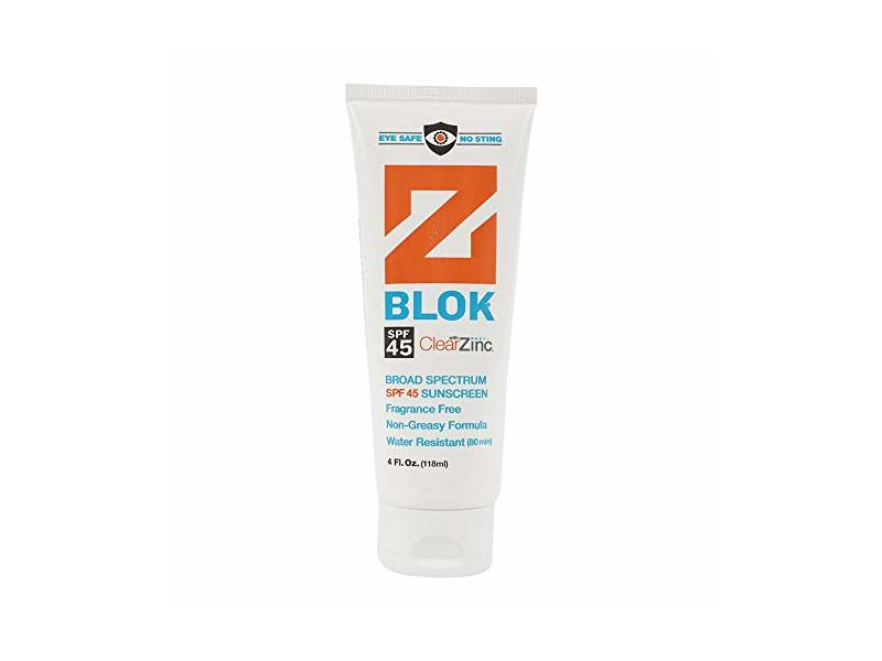 Eliminates the eye stinging problem with a zinc oxide, mineral based formula. Easily rubs in clear so no pasty look. SPF 45 broad spectrum protection.